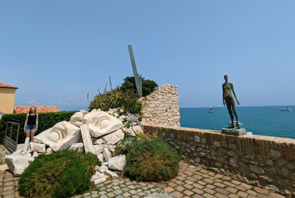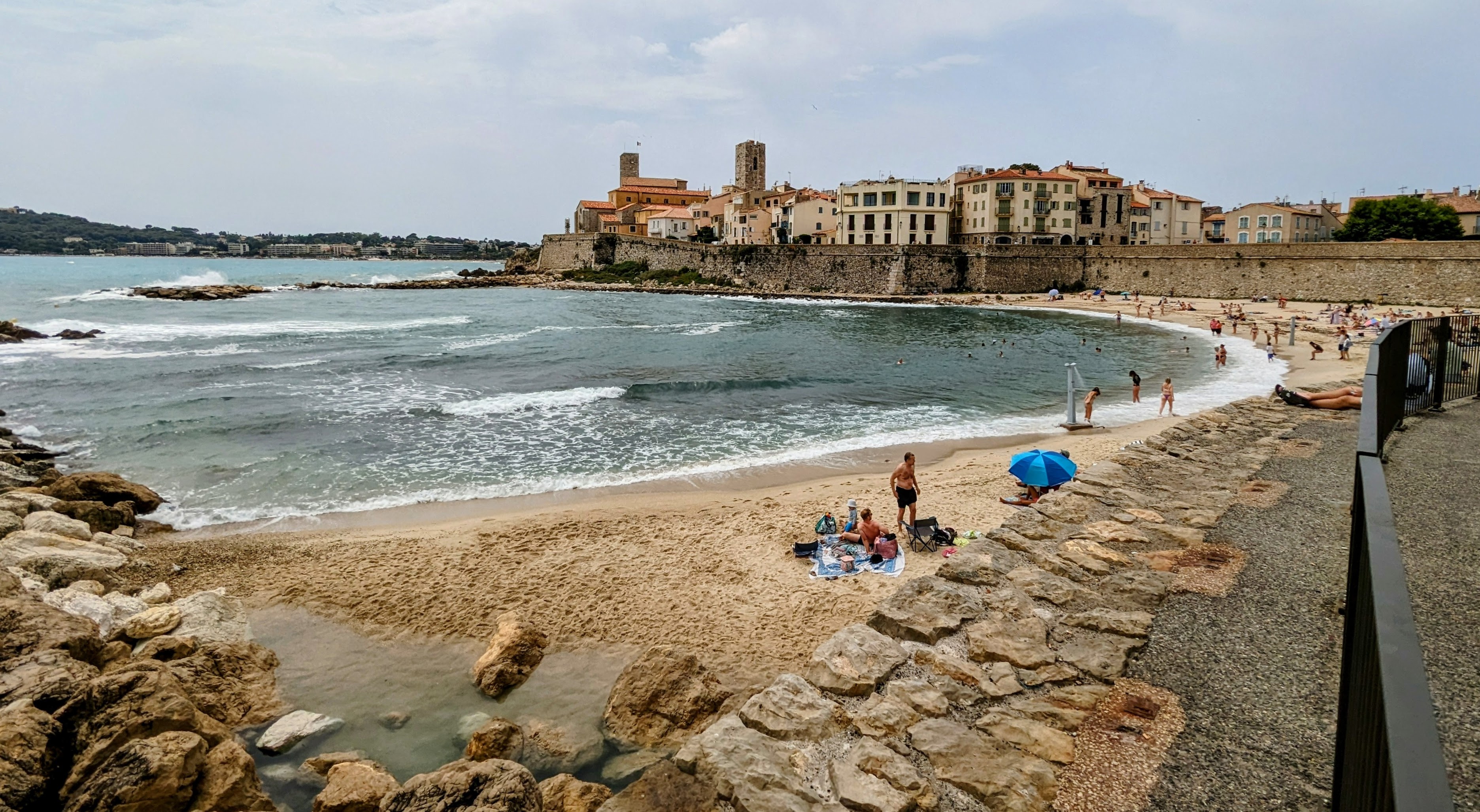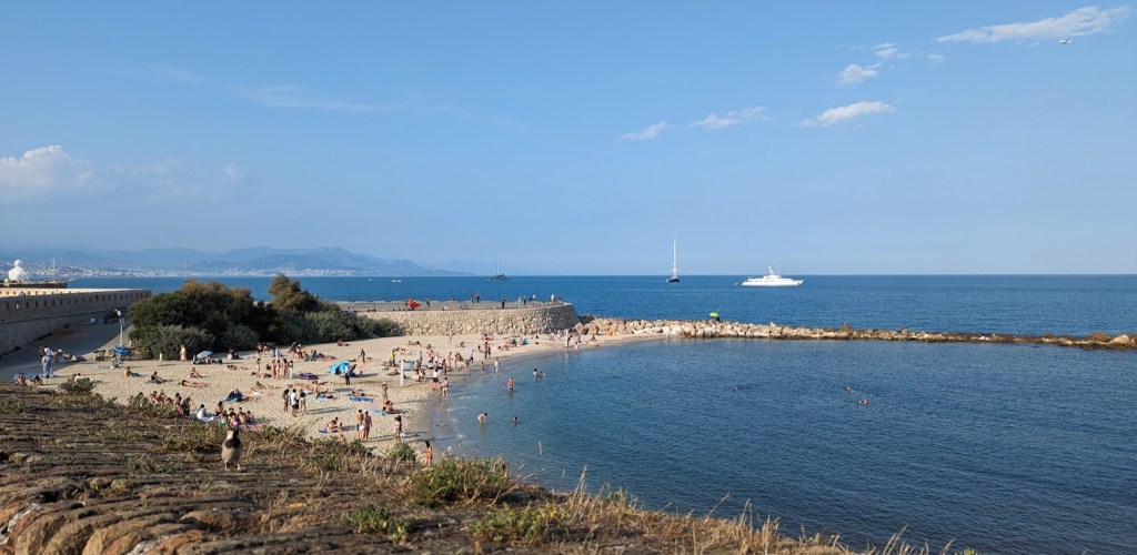 Of course, it can’t be the French Riviera without the beaches. We did check out two of them. Plage de la Gravette is the beach by the Antibes’ harbor. It’s a small beach with some sand and lots of small stones in the water. The atmosphere is vibrant, mostly young people. There are showers on the beach if you want to rinse the salty water. Getting in the water is a lot of fun since the stones are slippery and it’s very tricky to find your balance. Getting low in the water will help you balance better.