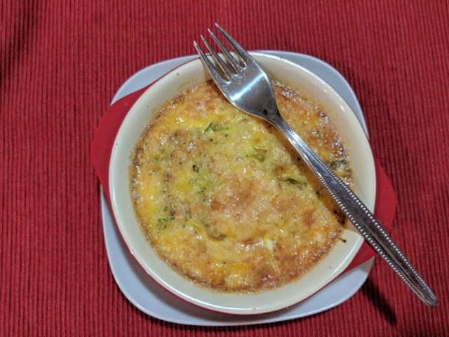Oil the ramekin. Add broccoli, add ham and shred cheese on top.