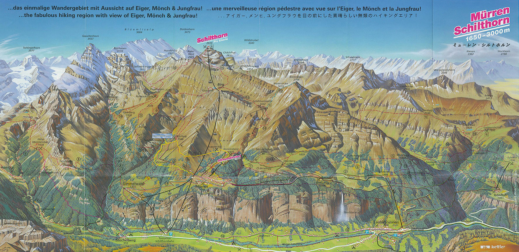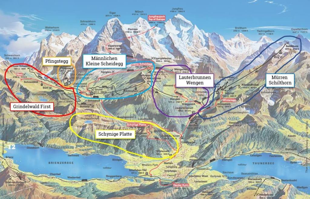 Hike starting from our base Wengen: Please look over this map to understand the mountains and areas in Bernese Oberland.